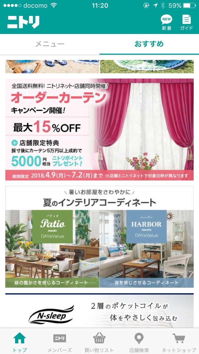 「ニトリアプリ」のトップ画面では、ニトリの最新情報をチェックすることができます。期間限定の商品や最新アイテムをチェックできるので、ニトリマニアの人にはたまりません。