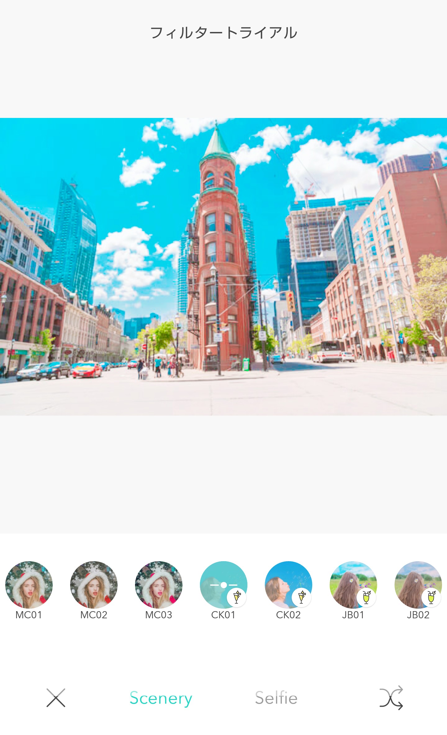 絵画のような風景を残したい時、過去に撮影した人物の肌・シルエットを補正したい時に活躍するのがCandyCamera。シーンごとにフィルター・加工は変えたいけれど、色々なアプリをダウンロードするのは抵抗があるときにもおすすめしたい加工アプリのひとつです。グリッド機能もついているので、風景撮影時のバランス構成を見る事もできます。