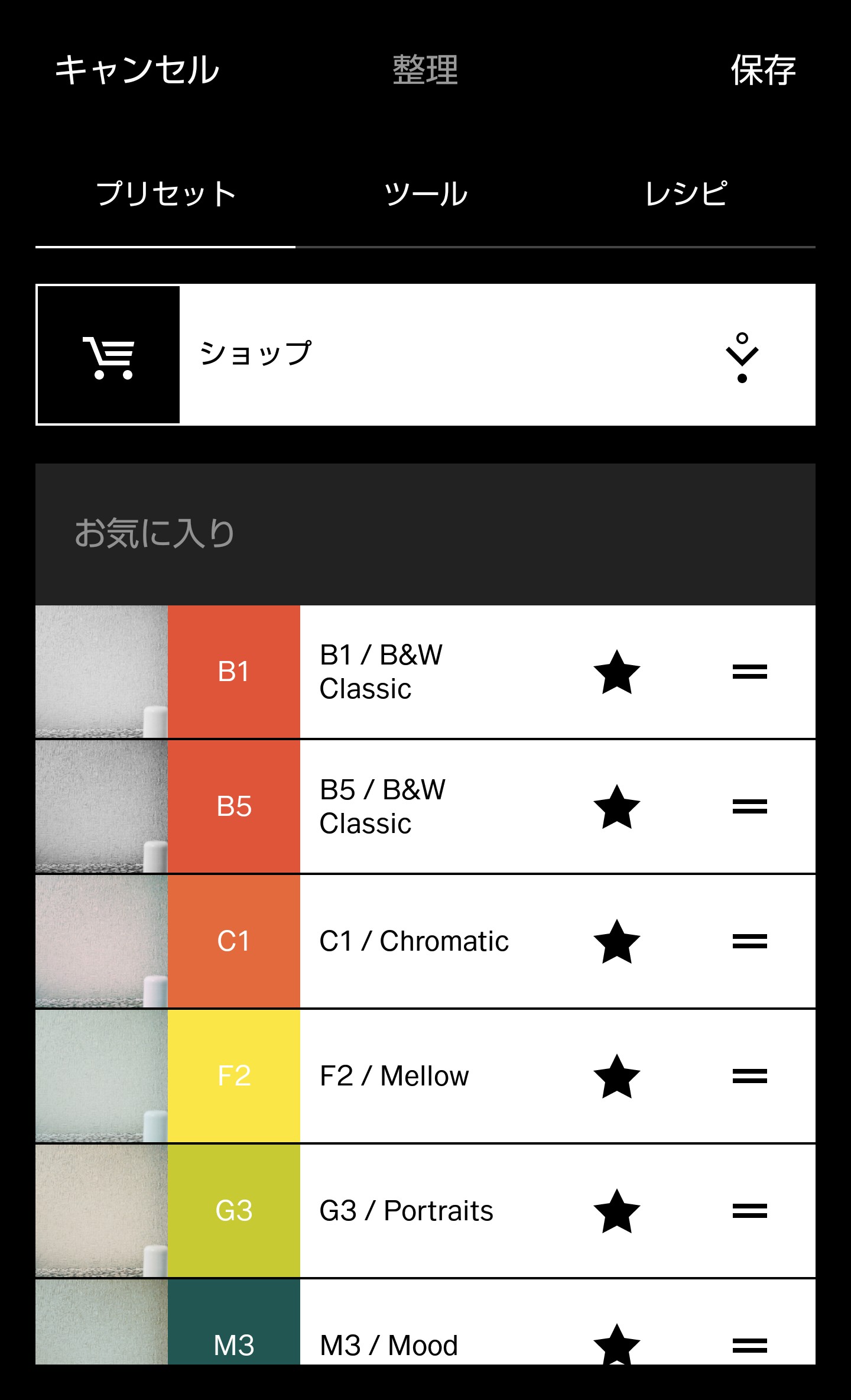 - お気に入りのフィルターや調整が見つかったらお気に入りレシピに保存可能