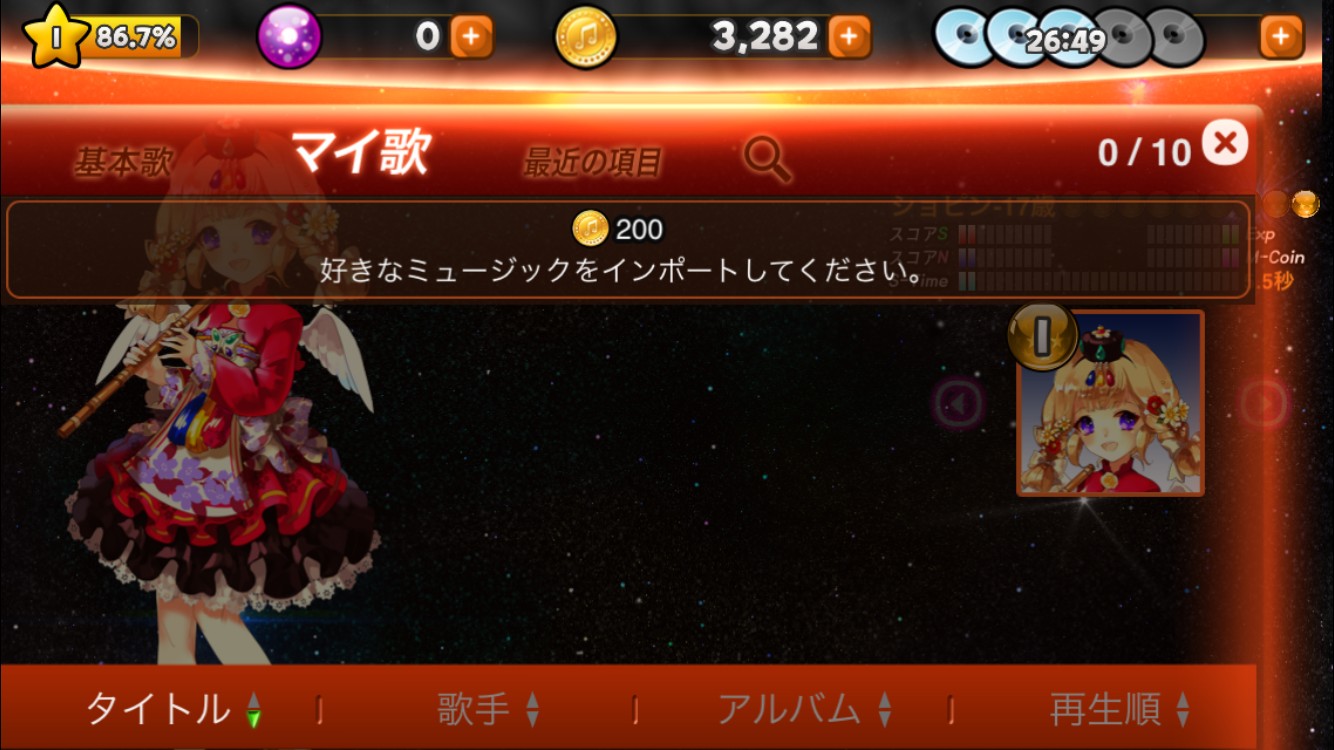 「ビットパンパン」にはゲーム内にもともと入っている楽曲もありますが、マイ歌というタブに自分のスマホの中に入っている楽曲をインポートして遊ぶこともできます。音ゲーは好きだけれど、自分の好きな曲になかなか出会えないという方も中にはいらっしゃると思います。マニアックな曲やアーティストが好きな方はなおさら、音ゲーで自分の好きな曲をプレイする機会はないのではないでしょうか?そんな方でも、「ビットパンパン」ならスマホの中から曲を選ぶことができるので安心です。インポートにはゲーム内の通貨であるミュージックコインが200必要ですが、ミュージックコインはゲームクリアで手に入るので、ゲームを遊んでいるうちに貯まっていきます。