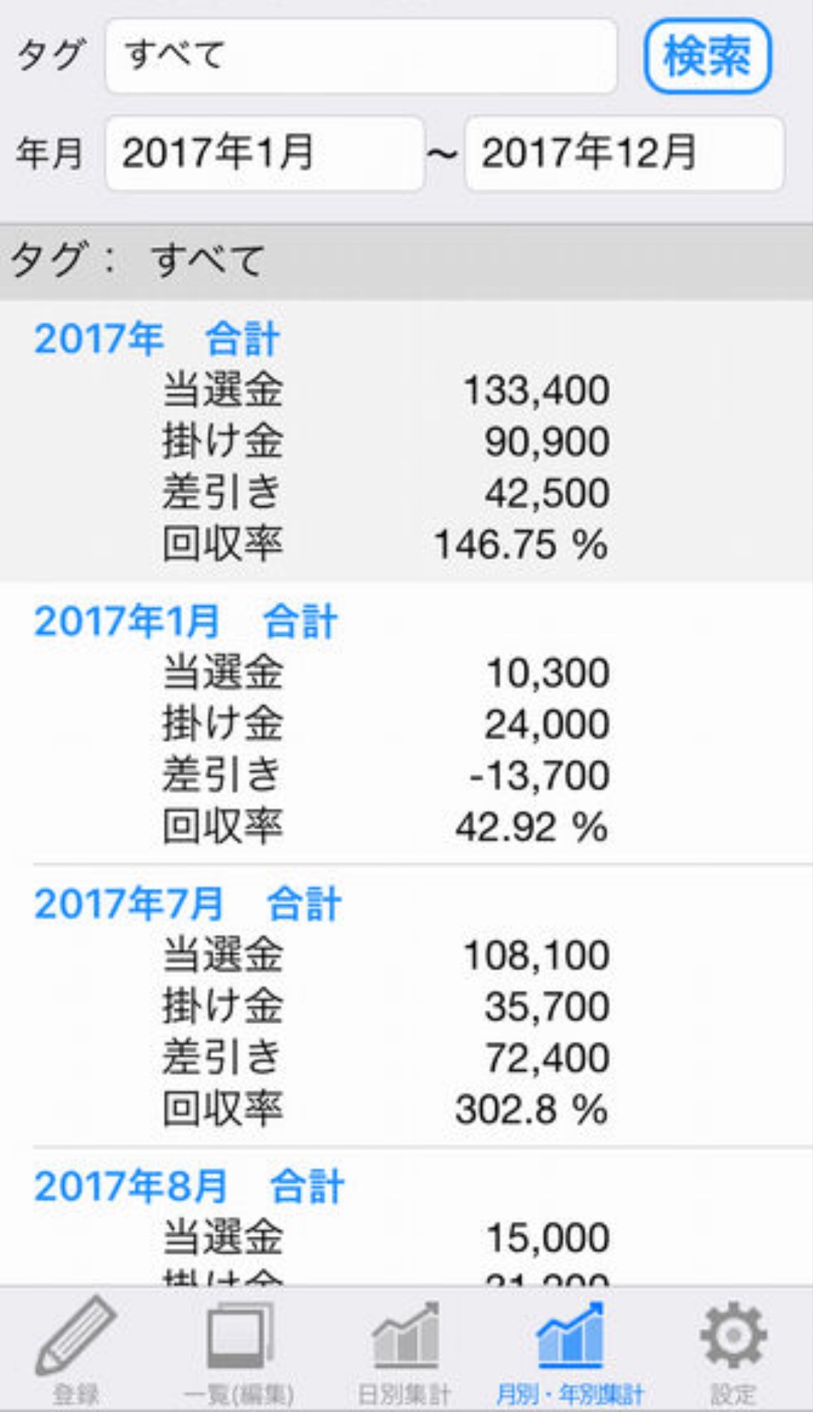 このアプリでは、宝くじやロトに使ったお金を記録していくことで、 月々の収支・年間の収支を集計してくれます。 今までなんとなく買っていた人も、なんとなくは把握はしていたけどという人も、収支や勝ち負けが一目瞭然になります。