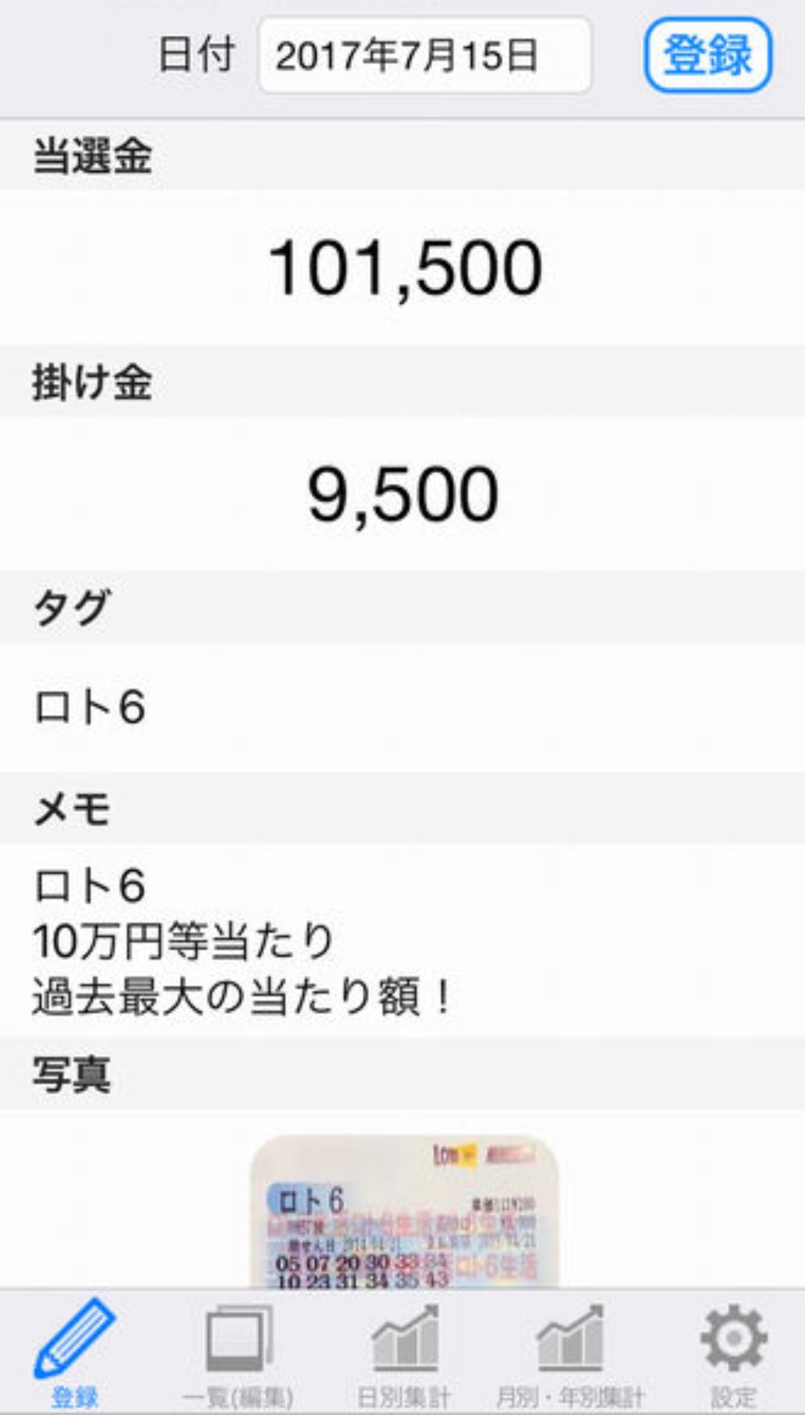 当せん金、掛け金、宝くじやロトといったタグ付けして管理することができ、メモも残せます。大負けをした、大当たりをした、など反省も喜びも書き残すことができます。