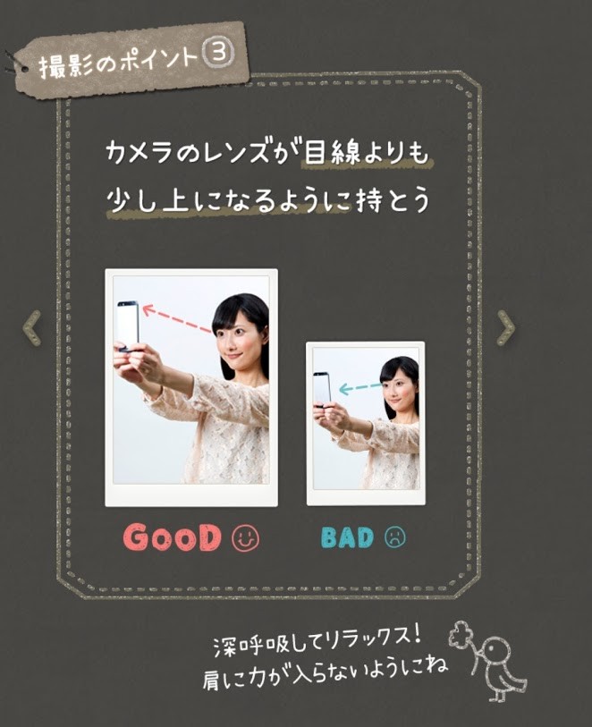 フレームに顔を合わせて撮影するだけなので、難しい操作が苦手な人でも心配いりません。目線やカメラの持ち方も、撮影ガイドを真似して撮るだけでOK。自撮りがうまくいかない人でも上手に撮影できます。