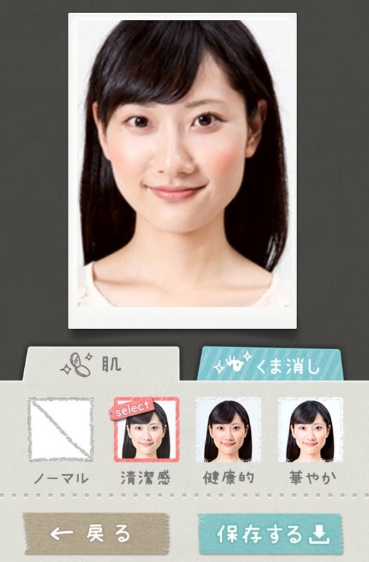 撮った写真に補正をかけることもできます。画像加工アプリとは違った、履歴書向けの自然な肌補正&クマ消しができるので好感度アップにつながります。