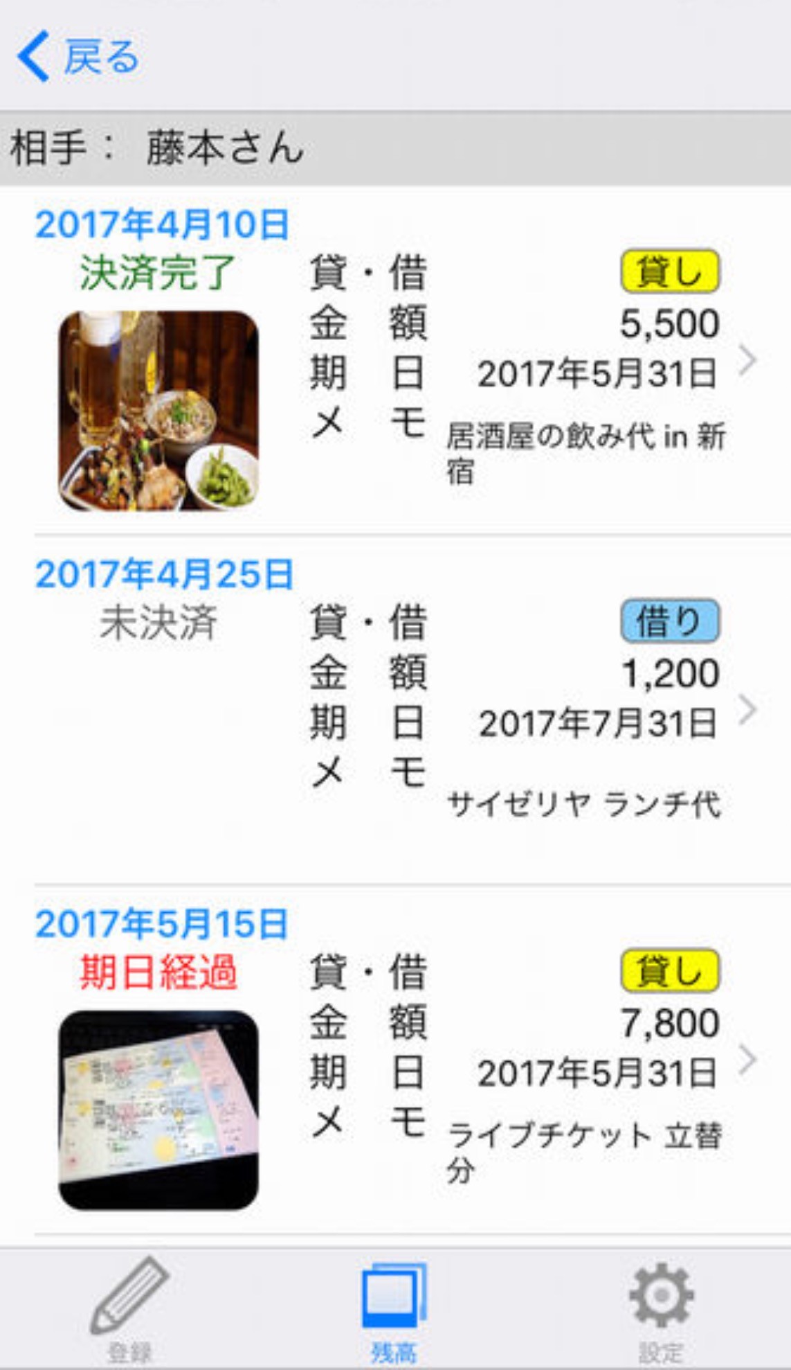 ① 誰に②いくら③いつまで、の項目があるだけでなく、合わせて記しておきたいことをメモできる機能や、画像を添付することもできます。