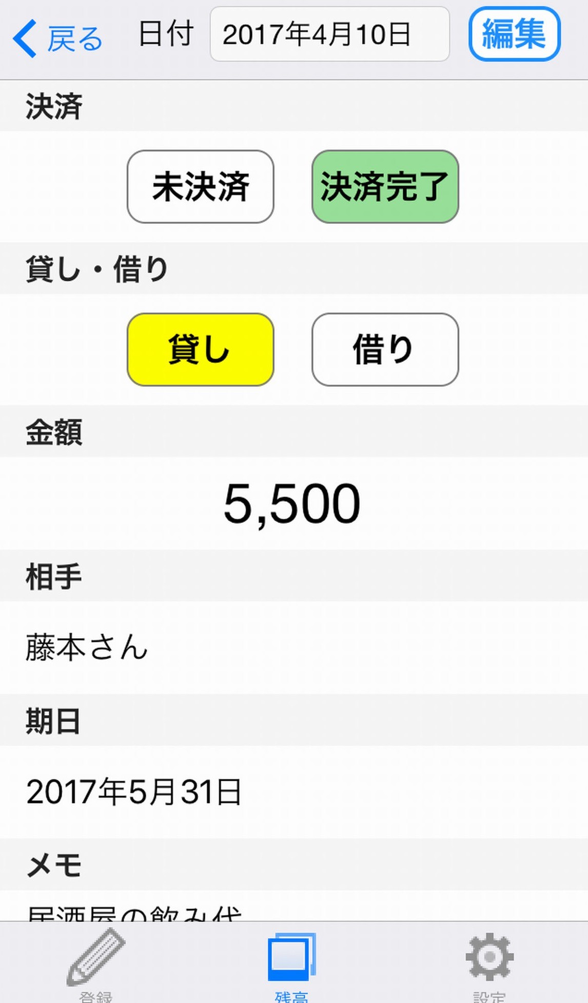 3.日付、金額、相手、期日、メモ、写真を変更する