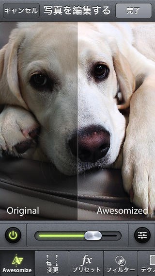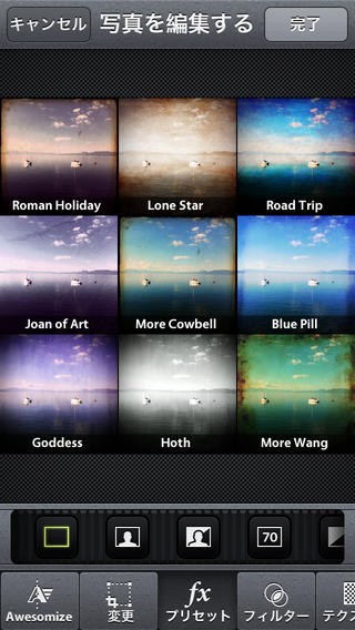 ・「Awesomize」ボタンは、色調など自動的に調整する機能でワンタッチでナチュラルなままコントラストをあげたり見栄えを良くします。右側のアイコンタップで手動調整に変えることも可能。• 創造的な編集ツール:表示ボタンで100以上の芸術的効果(セピア風・暖色・寒色、ノスタルジック風、等様々)が得られます。画面に各効果のイメージが9分割で表示されますので好きな効果を選んでください。