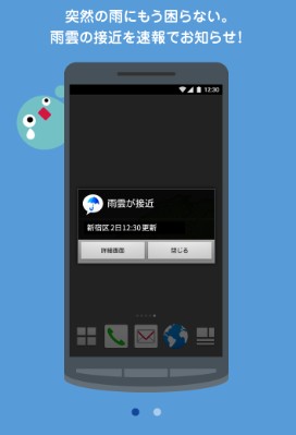 雨雲の接近や突然の雷雨の予報を、スマートフォン端末の通知音や通知バーで知らせてくれるので、度々アプリをオープンする必要はありません。