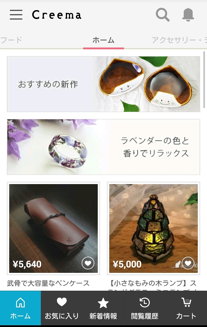アプリを起動すると、ホーム/お気に入り/新着情報/閲覧履歴/カートというメニューが表示されます。