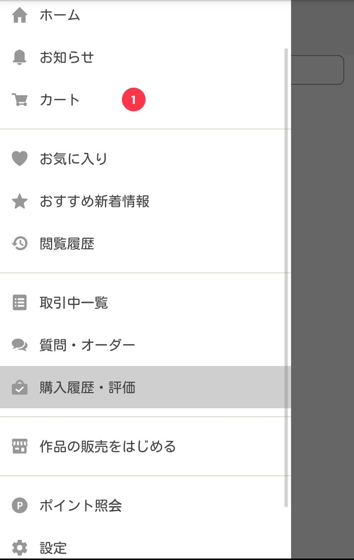 Creemaのメニュー画面ではカートの中身や購入履歴を確認できます。