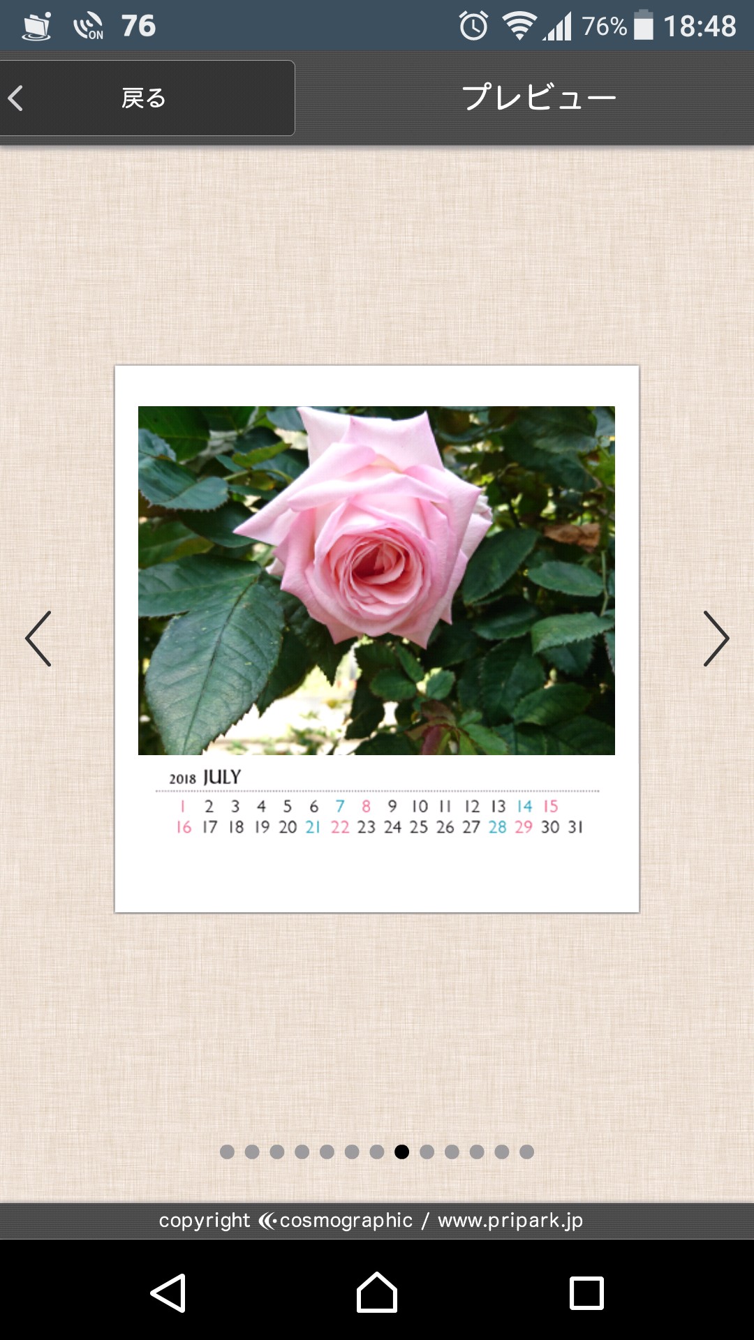 ポスターやガーランドは完全な装飾アイテムですが、部屋はシンプルが良い、そういうのは要らないという場合は、実用性もかねて写真入りカレンダーを作ってみましょう。「プリパークカレンダー」を使うと、卓上ミニカレンダーから壁掛けA3カレンダーまで4種類のサイズから作りたいサイズを選ぶことができます。最もシンプルで価格が安い卓上ミニカレンダーで1,280円(税込)です。