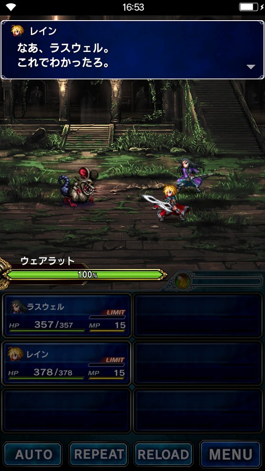 戦闘はフリックでコマンドを選び敵にダメージを与えるターン制で、オートや前回と同じ行動をとるリピードなど、ターンを円滑に運ぶためのシステムも用意されています。育成要素もキャラクター、装備、召喚獣、アビリティなど多く、お金をかけたから強くなれるといったものでもないのでやり込み派も満足するでしょう。