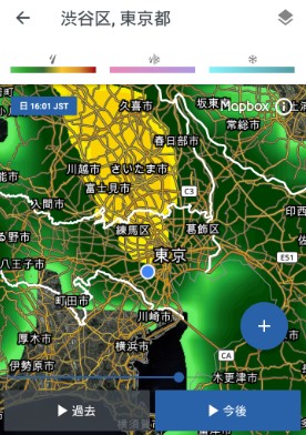 [過去]、または[今後]のタブをタップすれば、時間を追って、天気の状況変化をアニメーション映像で見ることができます。