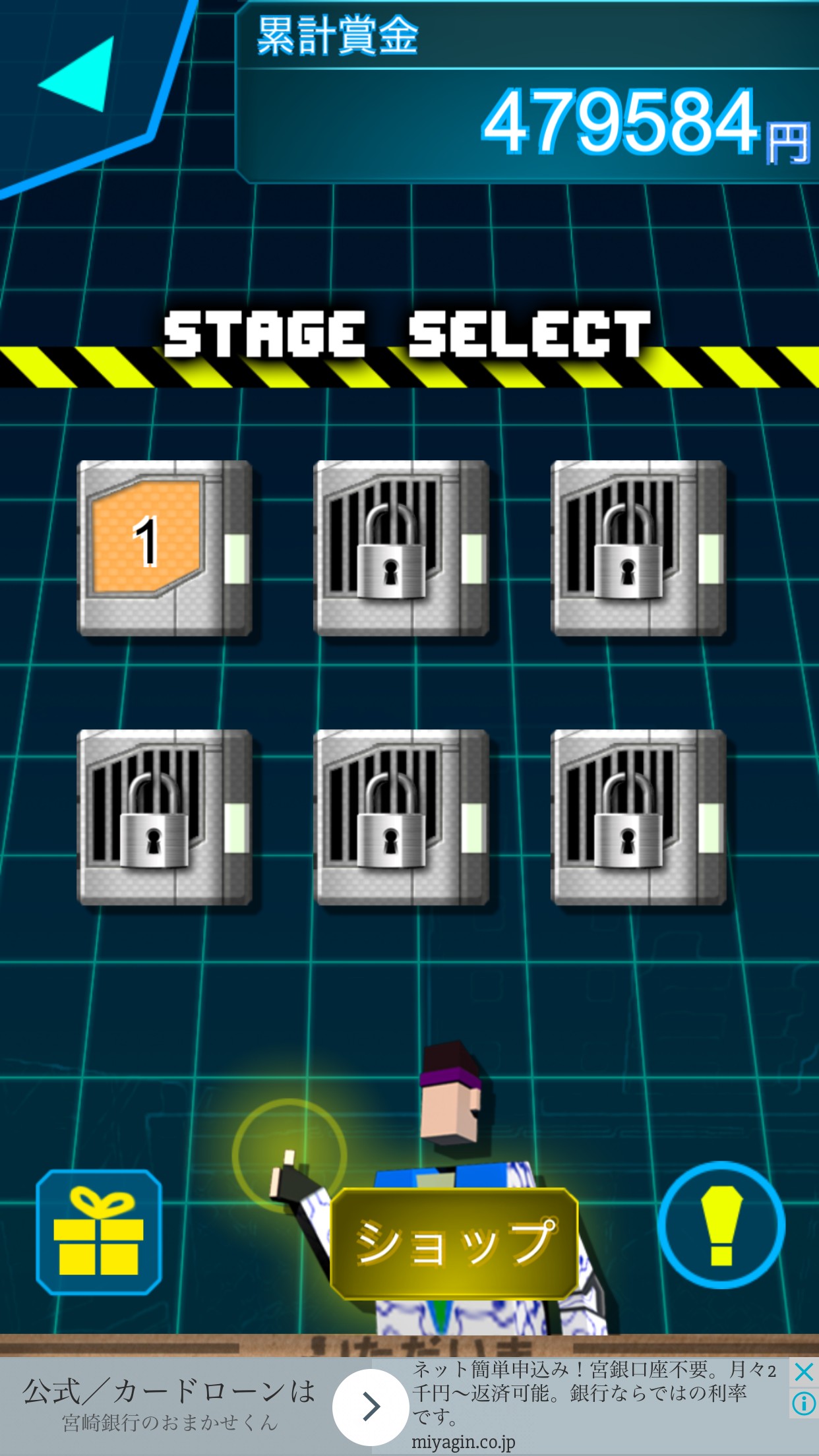初期状態でステージ1のみです。2以降は獲得した報酬で遊べるようになります。