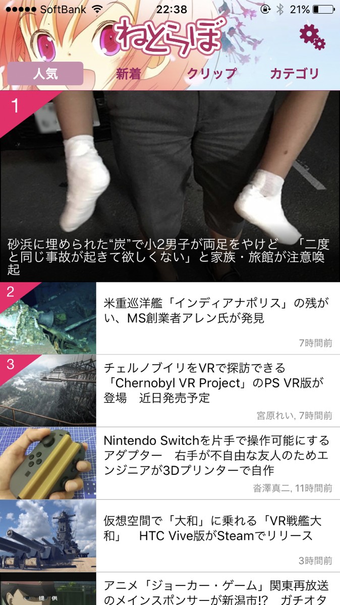 2.トップ画面は「人気」のニュースが表示されます。1位から3位のランキングが表示される他、人気の記事が10点掲載されています。その他、昨日のランキングや、先週のランキングも表示されるので、サクッとチェックしたい場合はこのページを見てみると良いでしょう。