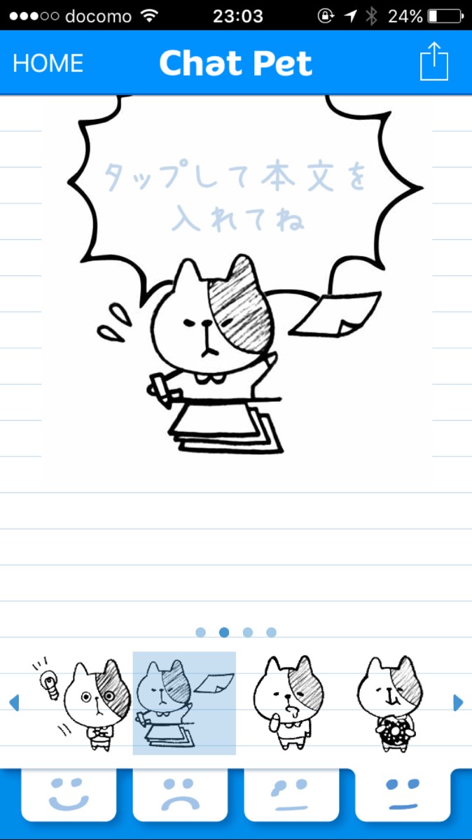 選択したキャラクターの吹き出しに自由に文字を入力できます。文字を入力したら、下部分に表示されているキャラクターの表情を選択しましょう。