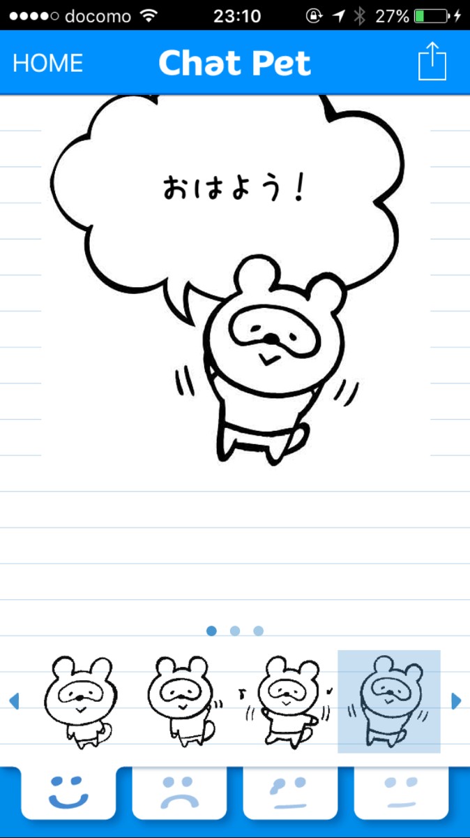 「ChatPet」は、様々なキャラクター、表情が用意されているのでスタンプ以外にも利用可能です。例えば、吹き出し部分を上手く活用して4コマ漫画を描いてみるのはいかがでしょうか。絵を描くのが苦手な人でも簡単に漫画作りが楽しめます!