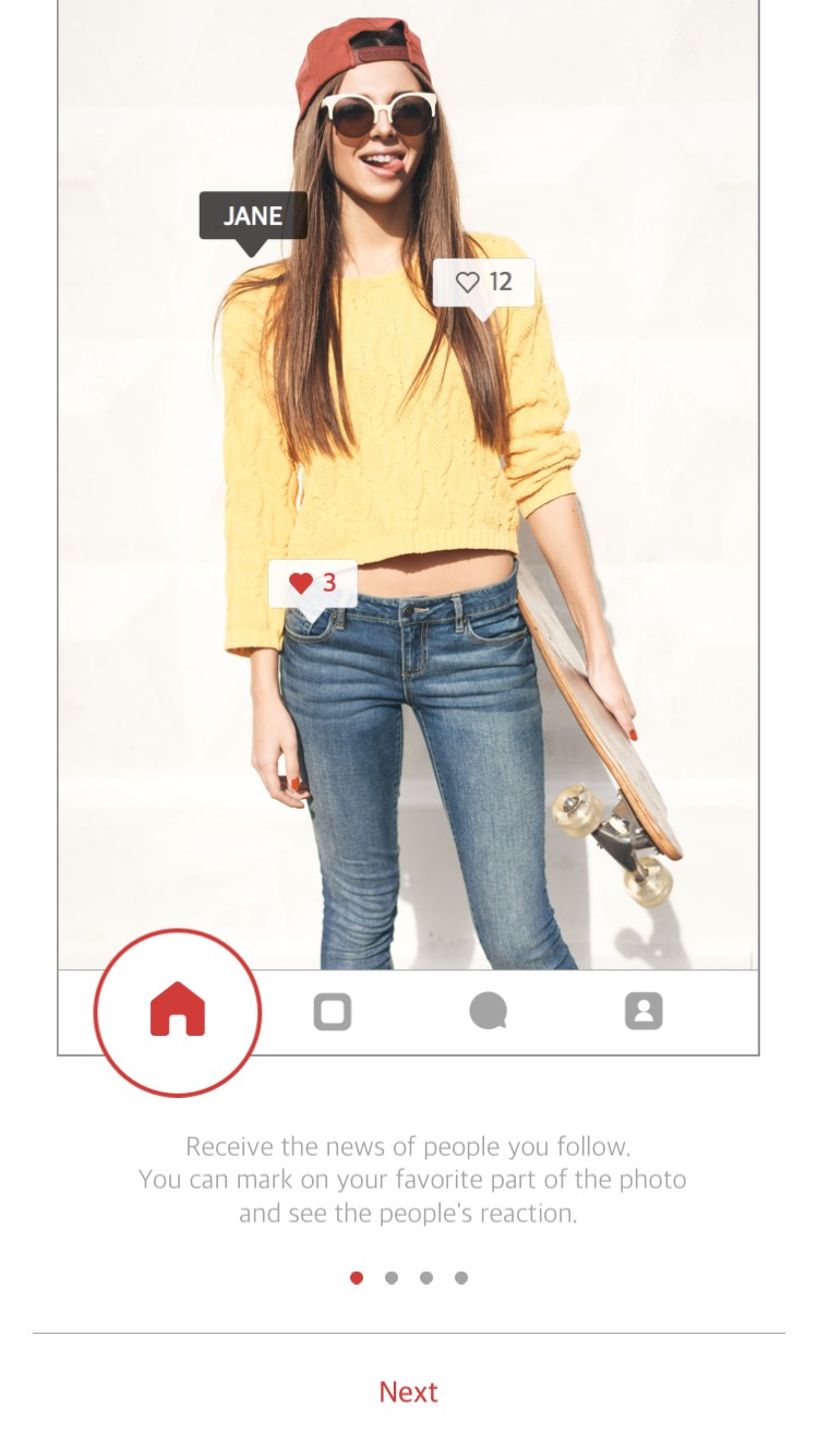 最初に表示されるホーム画面ではフォローした人の写真を見ることができます。最新の投稿したものをすぐにチェックできるので、見たら評価やコメントを残してあげましょう。