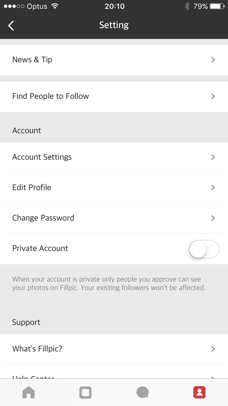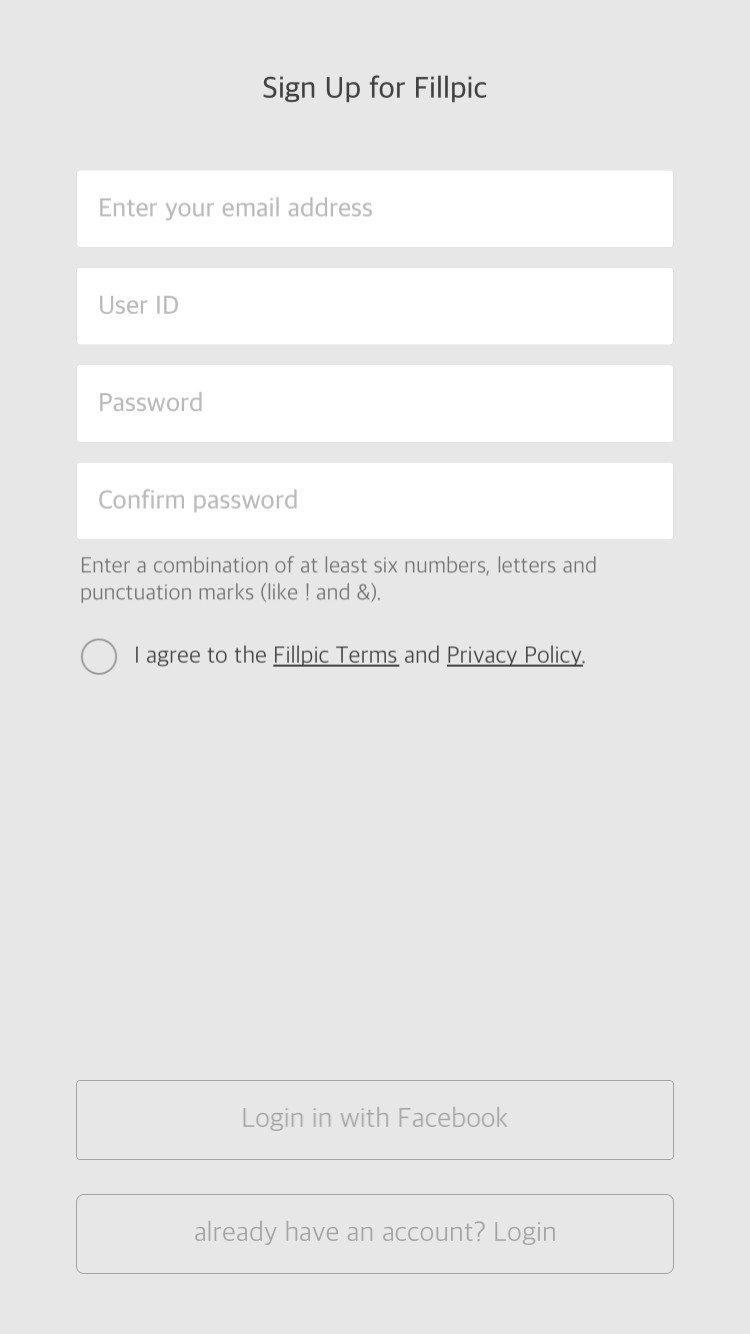 「Fillpic」を無料でダウンロード後、アプリを開いて登録をします。Emailアドレスとユーザー名、そしてパスワードを入力してはじめます。それ以上の入力は特にないので簡単に登録が行えます。
