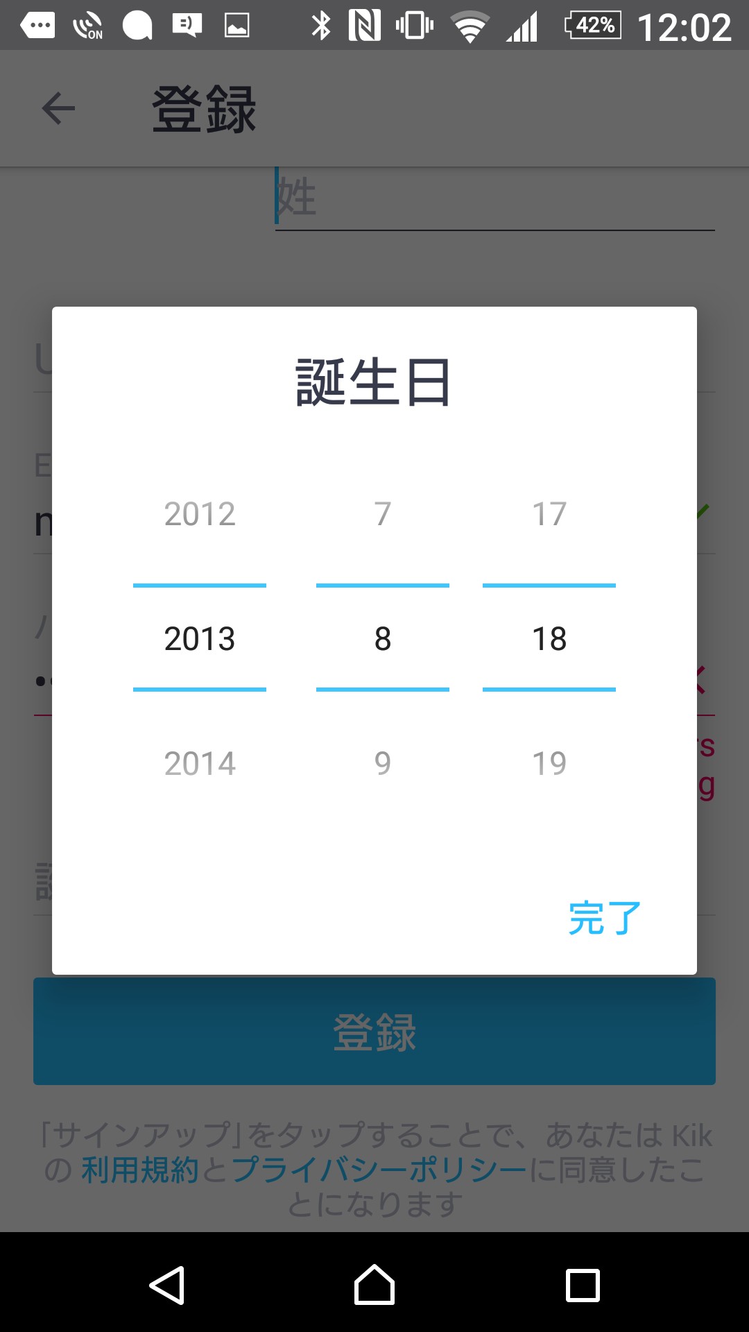 「Kik」は他のメッセージアプリに多くある電話番号の入力は任意なので入力しなくても始められます。名前、メールアドレスやパスワード、誕生日を入力してください。