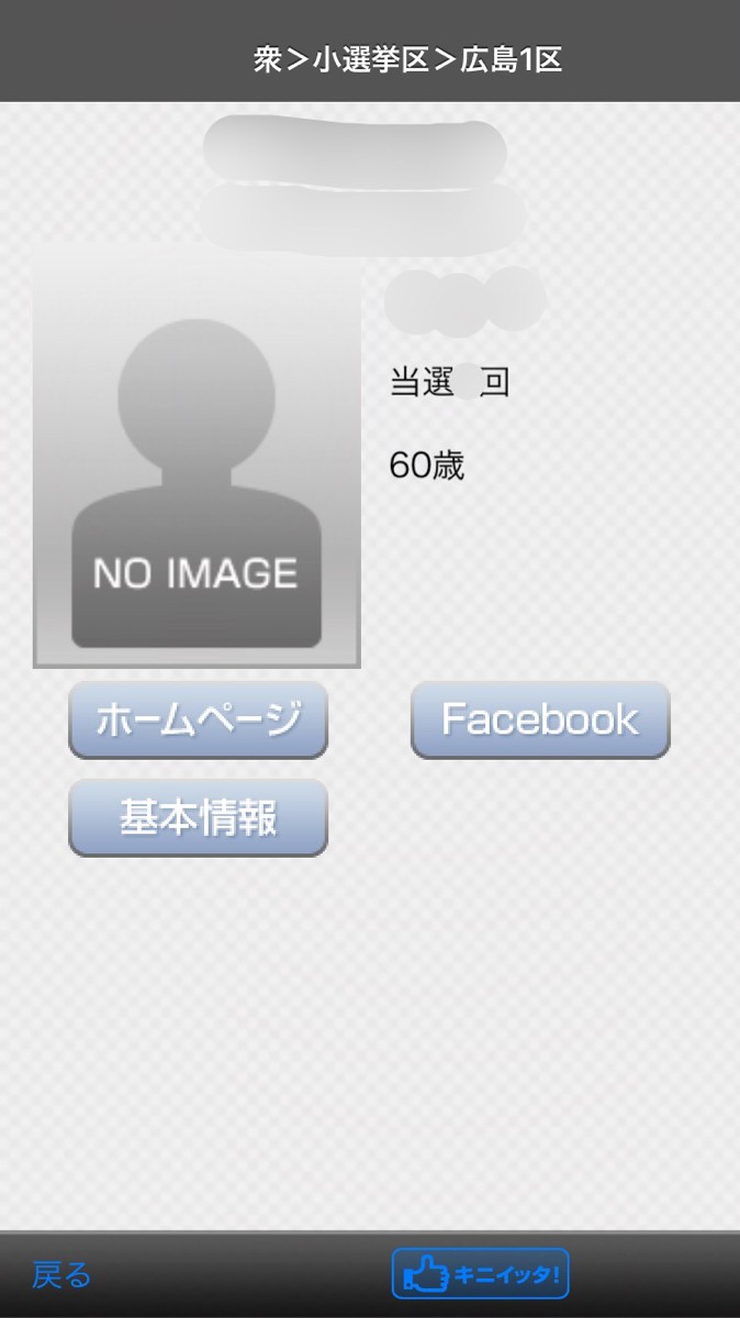 ・議員の基本プロフィールや、ホームページなどの情報を見ることができます。気に入った場合は、「キニイッタ!」をタップしてブックマークしましょう。