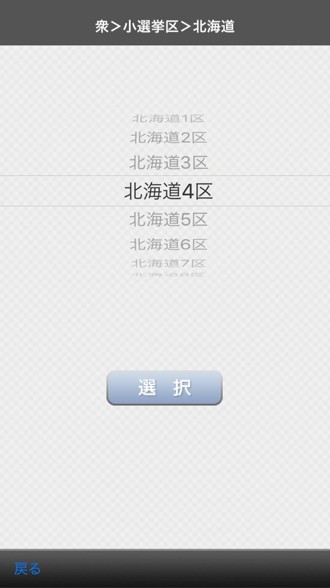 ・衆議院の小選挙区を見たい場合は、「衆議院」→「小選挙区」→「地方名」→「選挙区」を準に選択していけば、議員のプロフィールに辿りつきます。ここまで、自分で文字を入力したりする必要はなく、すべてワンタップで可能です。