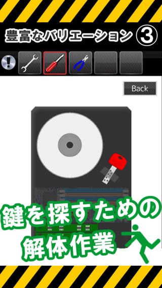 「脱出ゲームマンホール注意」のメインはマンホールですが、工具でネジやボルトを外すことでマンホールを開けることができます。操作はタップだけで完結します。上の欄にあるアイテムは必ず使うことになりますので、このアイテムもヒントとなります。ステージはいろいろあり、動物のいるステージなどもあります。また、アイテムにはバリエーションがあり、脱出するための鍵を探す作業もあります。
