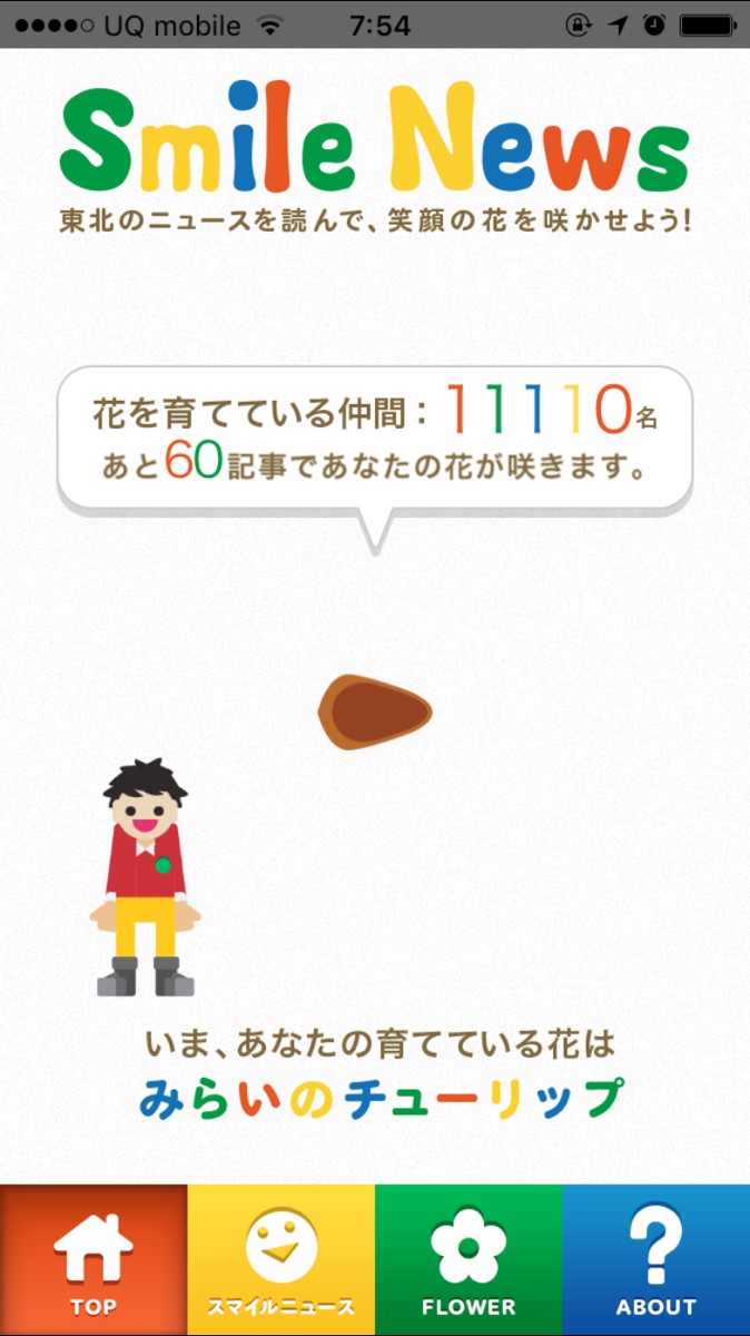 ニュースを60件読むごとに、種から芽が出て成長していき、最後は花開きます。笑顔の花は「みらいのチューリップ」からスタートして、全部で12種類。最後の花は「まかふしぎのはな」といって、「SmileNews」をたくさん読んだ人でないと育てることができません。どんな花が咲くのか楽しみです!