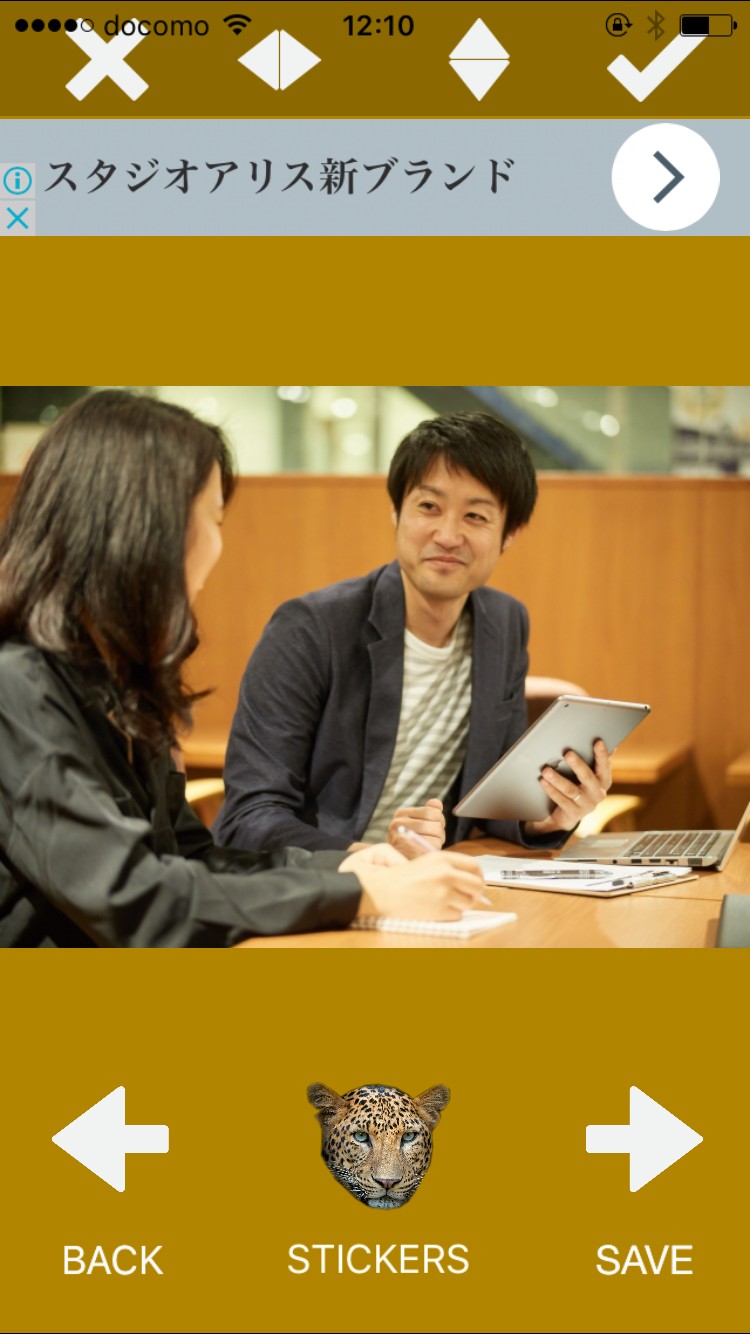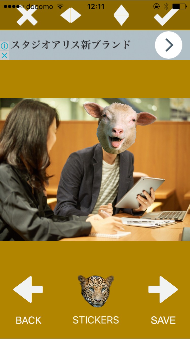 写真に動物スタンプを張り付けるというシンプルなアプリですが、スタンプはサイズや向きの調整、上下左右の反転も自由自在なので、顔の上にうまくフィットさせることができれば綺麗に仕上がります。