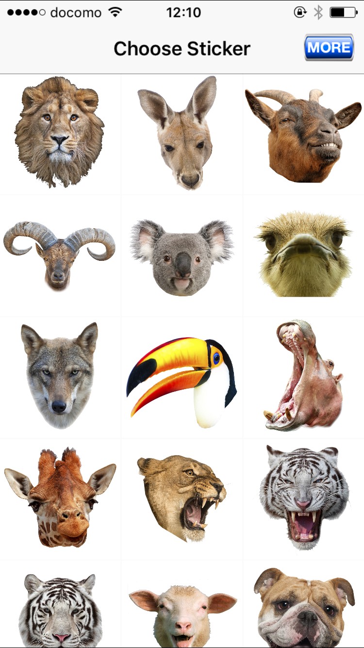 画面下部のトラのマーク「STICKERS」をタップすると、動物スタンプの一覧が表示されます。いろいろな動物のいろいろなアングルのスタンプがたくさんありすぎて迷います~!!ライオンやトラはちょっと怖いので、優しくヒツジさんでいきましょう。メェ~。