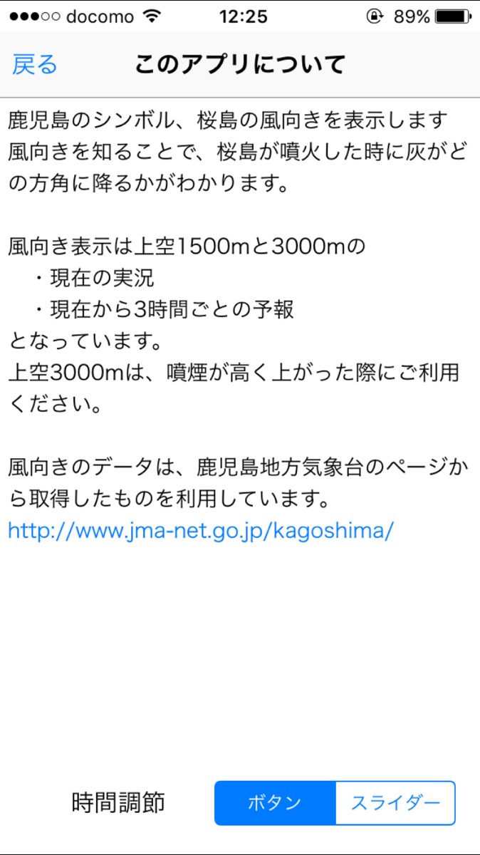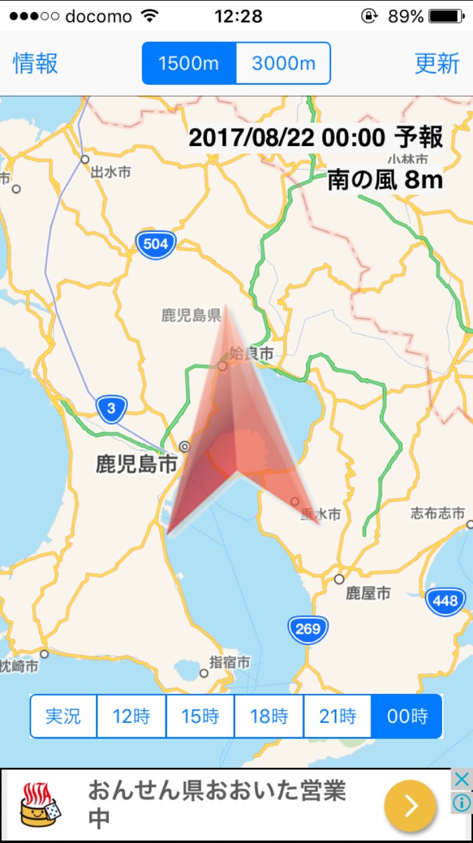 画面下には「実況」ボタン以降、3時間ごとの時間が表示されています。近い未来の風向き予報を確認することで、日々の洗濯を干す時間や火山が噴火した時などに役立ちそうですね。