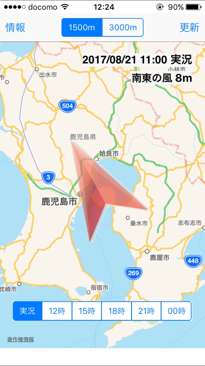 桜島の活動が穏やかな普段は、上空1500mの風向きをチェックします。しかし、日本の活火山の中でも、活動が激しい桜島は噴煙が高く上がることもしばしばありますよね。そんな時は、上空設定を1500mから3000mに変えて、風向きを確認しましょう。
