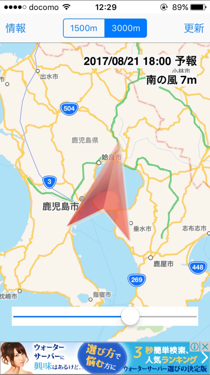 「桜島風向情報」は、アプリ名の通り桜島上空の風向きを確認するアプリです。このアプリのホーム画面は、桜島周辺の地図が表示されています。そこには、ドドーンと大きな赤い矢印が確認できるでしょう。この大きな赤い矢印は、桜島上空の風向きを表しています。このアプリで見れる情報は、現在の風向きと風速、さらに現在から3時間ごとの予報だけとシンプルなものです。シンプルだからこそ情報がわかりやすい、桜島上空の風向きに特化した便利なアプリなのです。