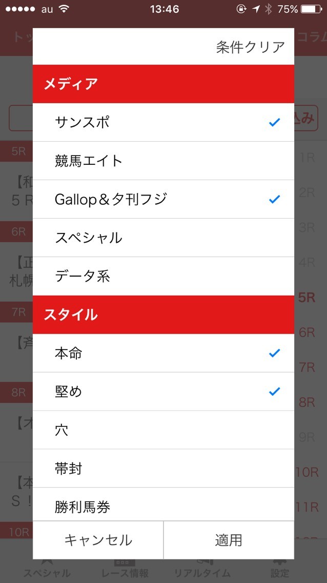 このように簡単に操作することが可能です。画面右上の「絞り込み」をタップして、参考にしたいメディアや予想スタイルなどの条件を設定して検索したり、右端のレースの数字を選択すれば、各レースごとの予想を簡単に閲覧することが可能です。また、画面を左右にスワイプすることで、各メニューを切り替えることができます。画面上を下に引っ張るとデータが最新情報に更新されます。