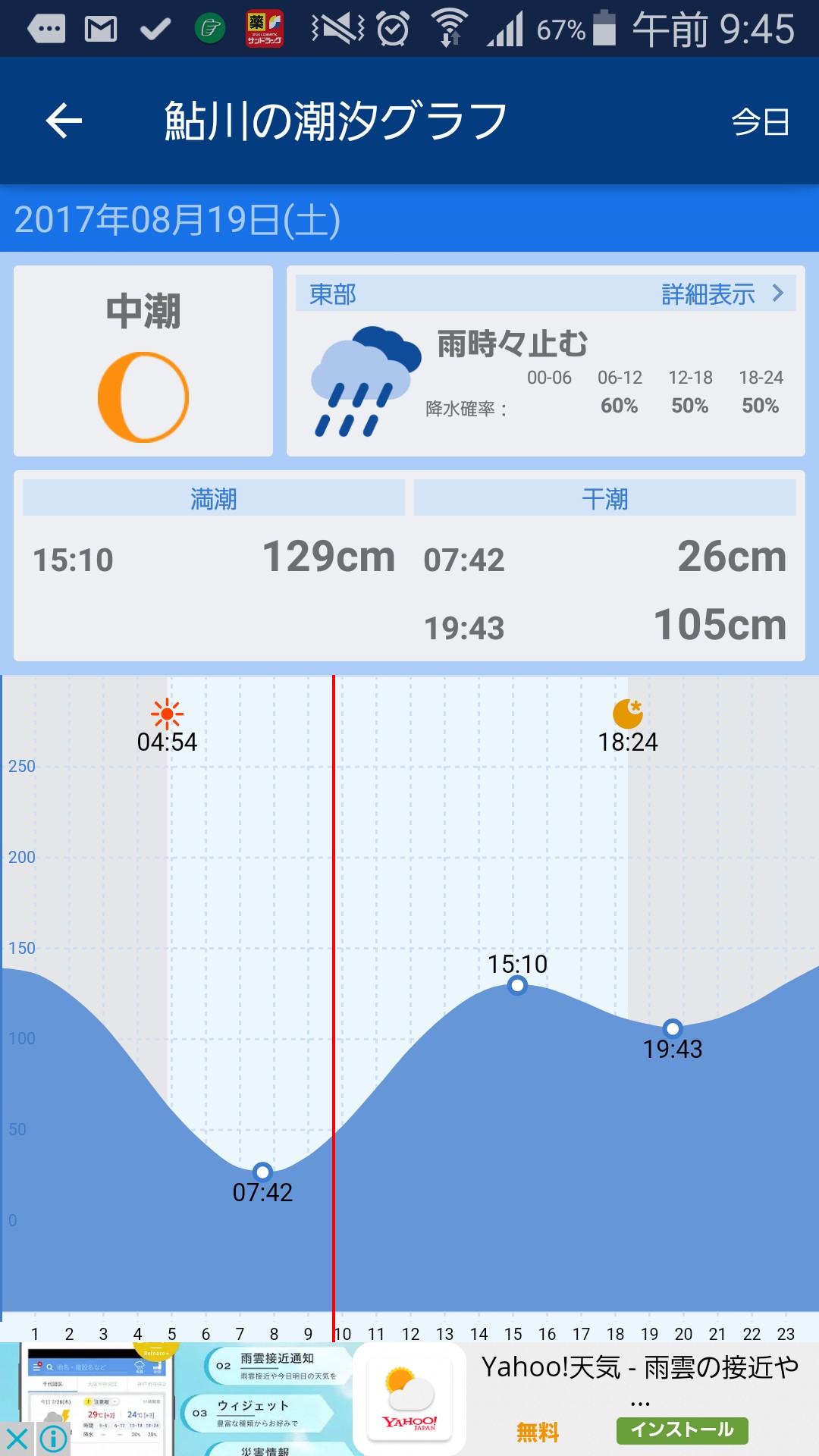 このアプリは、地域と日付を選んで検索ボタンを押すだけで満潮の時刻や天気予想などをチェックできるアプリです。釣りは、一般的に潮が動いている時に魚が良く釣れると言われています。このアプリで満潮、干潮の時刻や潮汐表をチェックすれば、潮が動いている時間も簡単に予測することができます。また、天気予想もあるので雨への対策も万全です。