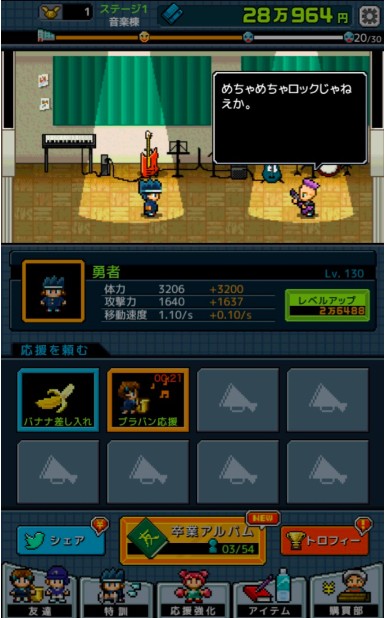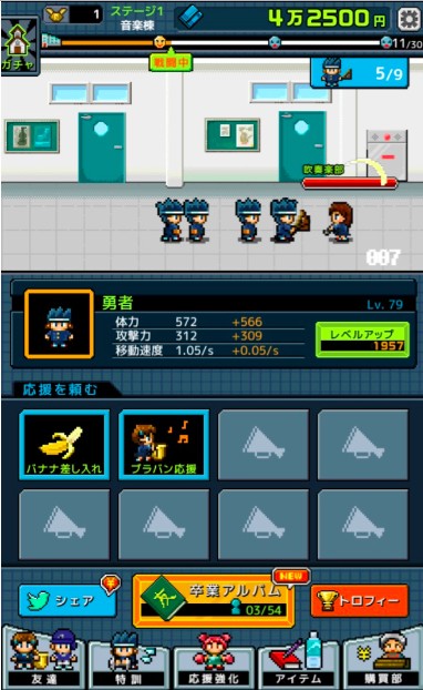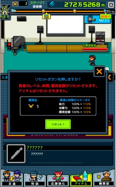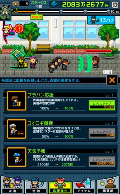 ゲームでは、出現する各部活の生徒たちを倒しながら、所持金を増やして勇者のレベルを上げていきます。
