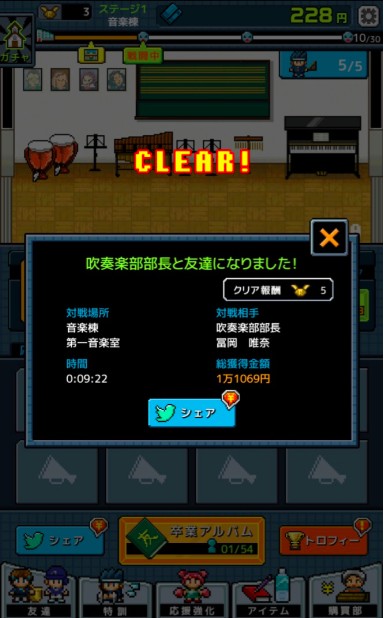ステージの最後には、各部活の部長が控えており、部長とのバトルに勝利すると仲間にすることができます。