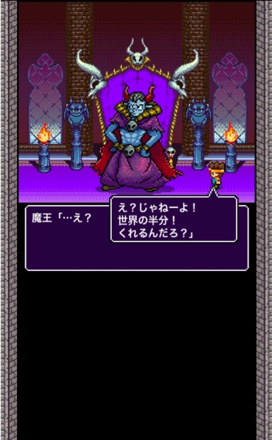 懇願に負けて魔王を助けた勇者でしたが、それ以降も魔物は一向に減る気配を見せません。ヤケになった勇者は、本当に世界の半分をもらってしまおうと、魔王の城に押しかけます。
