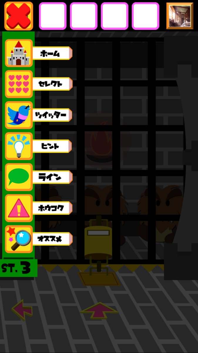 3、各ステージが上下と左右に合わせた4つの画面構成。左右の移動のみならず、天井などくまなく怪しいと思うところを徹底的に調べて、アイテムをゲットしたり謎を解いていきます。最終的には牢屋の鉄格子を開けて脱出したら、ステージクリアです。