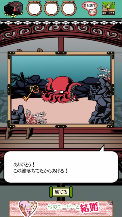 「脱出ゲーム 浦島太郎」の遊び方は、海の中にいる生き物とお話しすることができます。「お魚と話す」を選択するとお話を聞くことができます。脱出するには、タップして怪しい場所を調べたり、アイテムを選択して使用することができます。左右のカーソルでフロアを移動することもできます。画面をタップして拾ったアイテムは画面上部に表示されます。拾ったアイテムを使いたい時はアイテムをタップして、背景が赤くなっていることを確認しましょう。あとは、アイテムを使いたい対象物をタップすればアイテムを使うことが可能です。基本操作はタップのみなので、誰でも簡単にプレイすることができます。