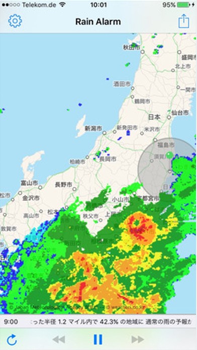 朝、家を出る前にテレビで天気予報を御覧になってから、通勤通学に出かける人は多いですが、夕刻以降の帰宅時には様々な要素で予報とはズレてしまうのはよくあることですし、ある程度、あきらめている? そんな方はいつも携帯しているからチェックも早い、お知らせも早いアプリ「雨アラーム」はとても便利。なんといっても自分が数時間ごとに確認することも必要なく、「お知らせ」が来るのですからなんとも親切なアプリです。この閲覧可能な雨雲レーダーを見ているうちに、大体どの色味を移動の動きをみると天気の予報士さんになったような気分です。また主婦の方々にも、お洗濯などで天気は大事ですから簡単且つ丁寧な表示で一歩秀でた「雨アラーム」をオススメ致します。早速使用感をお試しください。