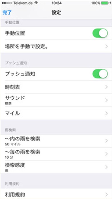 メイン画面の設定ボタンをタップすると表示されるメニューから「設定」を選ぶ→更に「雨アラーム」は細かくカスタマイズすることができます。その設定内容は・マップの種類を変更する。・現在向いている方角を表示する(これで雨がこれから降る方向を考慮して大体の降られない方向へ進むようにするなど)アプリの察知するエリアを円形で表示する。・雨量を色別に表示再生する時間幅。雨の予報の対象地域の手動の設定。・通知のONとOFFの切り替え・通知音の設定・距離の単位の設定、変更・雨検索のエリアの範囲を設定する・雨雲の検索の何分毎の周期で行うかを設定する・さらに雨雲検索の感度の設定もできるという優れた機能で微細にあなたの要望に応えてくれます。