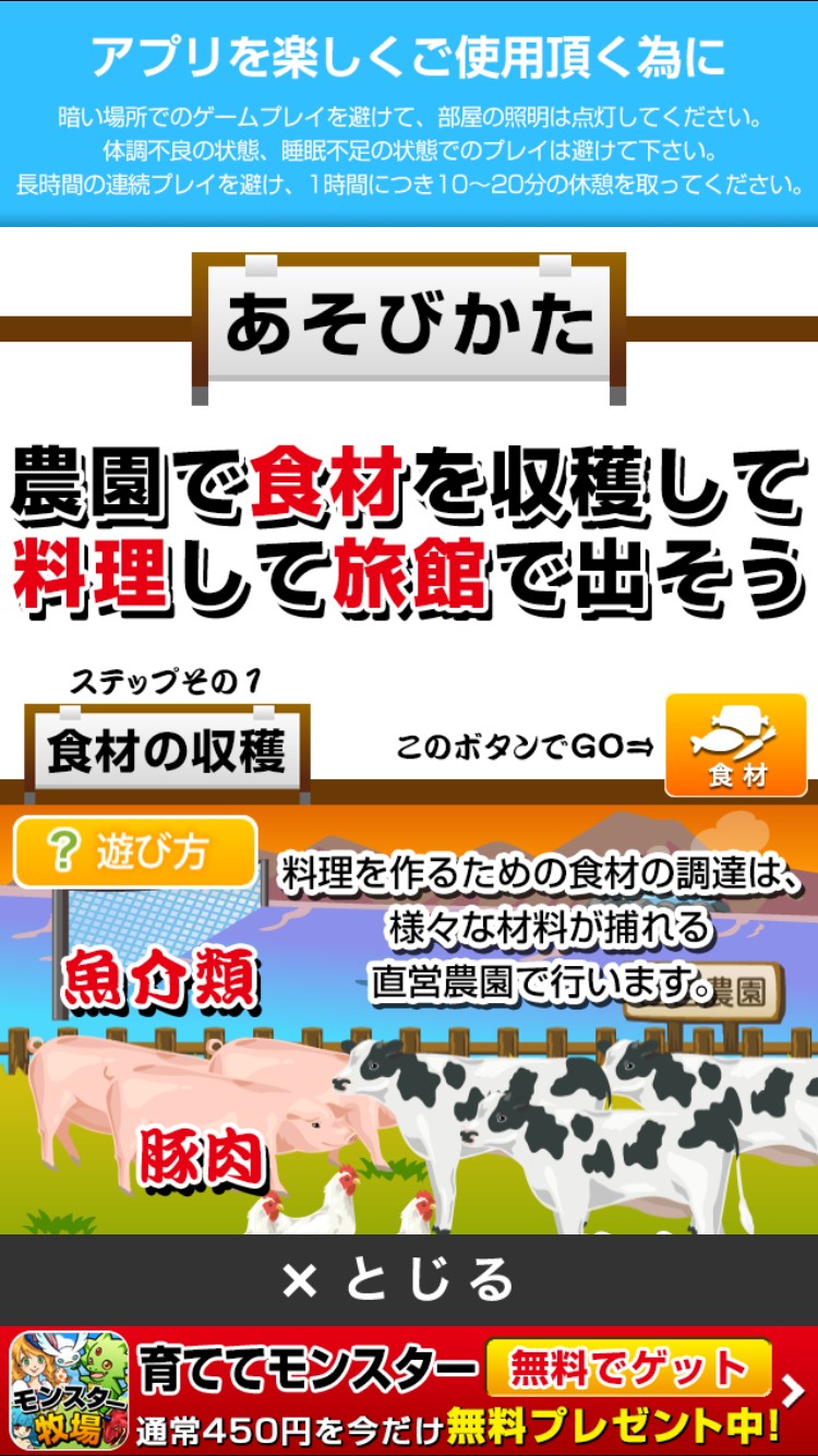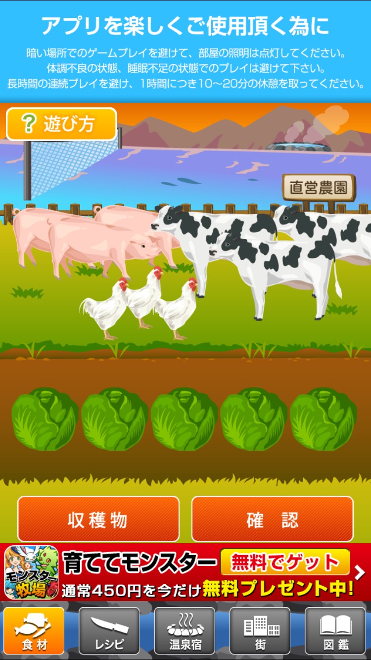 「旅館を経営しよう!」をはじめるとのんびりとしたBGMが流れてきます。最初にはじめる食材の収穫画面には牛や鶏など農場らしい場面なので可愛らしい動物とのんびりとした音楽で癒されます。