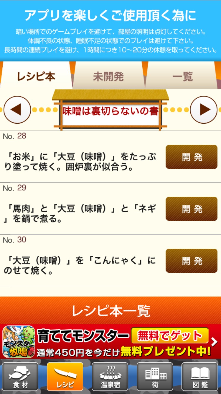 旅館に出てきそうなレシピがたくさんこのゲームには入っています。必要な食材が集まったらレシピから調理をすることができます。自分で焼く、煮る、揚げるなど選択ができるので料理人になった気分で美味しい料理を作ってみましょう。食材をどんどん集めて全部のレシピを制覇できるように頑張りましょう!