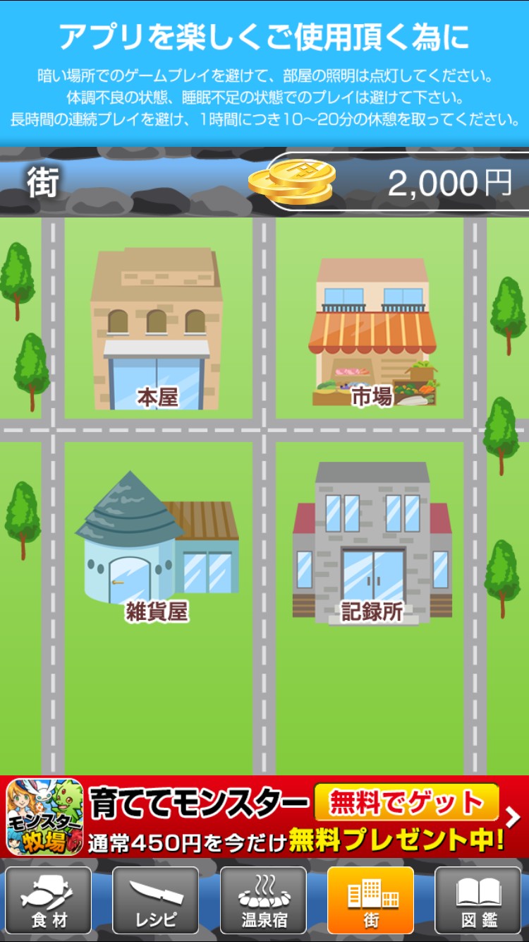 「旅館を経営しよう!」は、街へ行くこともできます。街にはお店があり、本屋、市場、雑貨屋、記録所があります。本屋では新しいレシピを買うことができ、市場では自分が収穫したものがある食材だけを買うことができます。雑貨屋は、旅館や農場を大きくするためのアイテムを買うことができるのでお金を貯めて拡大することも経営者の1つの仕事です。記録所とは、他のプレイヤーがどれくらい稼いでいるのか、食材を集められているのかランキング式で見ることができる場所です。