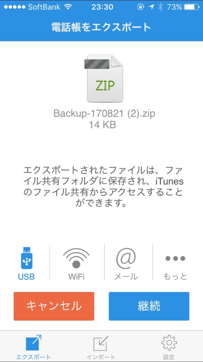 「SA 連絡先 Lite」で実際にバックアップをとってみました。