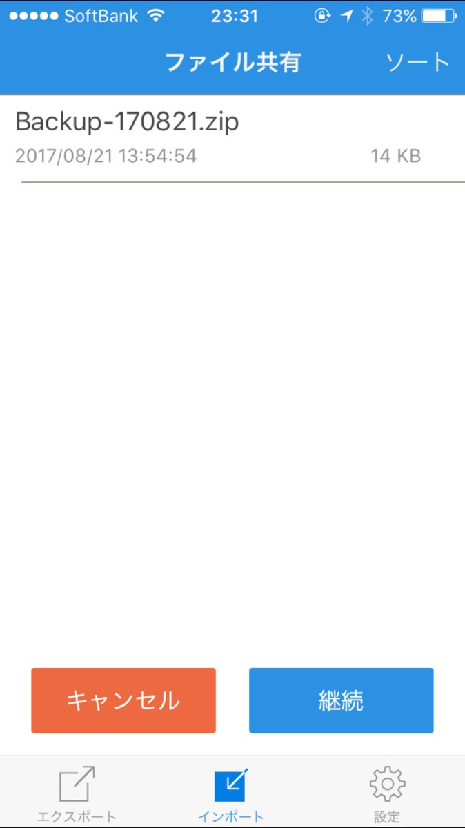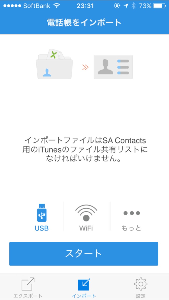 PCで更新したデータをスマホに戻してみましょう。「インポート」をタップするとインポート経由方法が選べます。好きなものを選んで「スタート」をタップしてください。