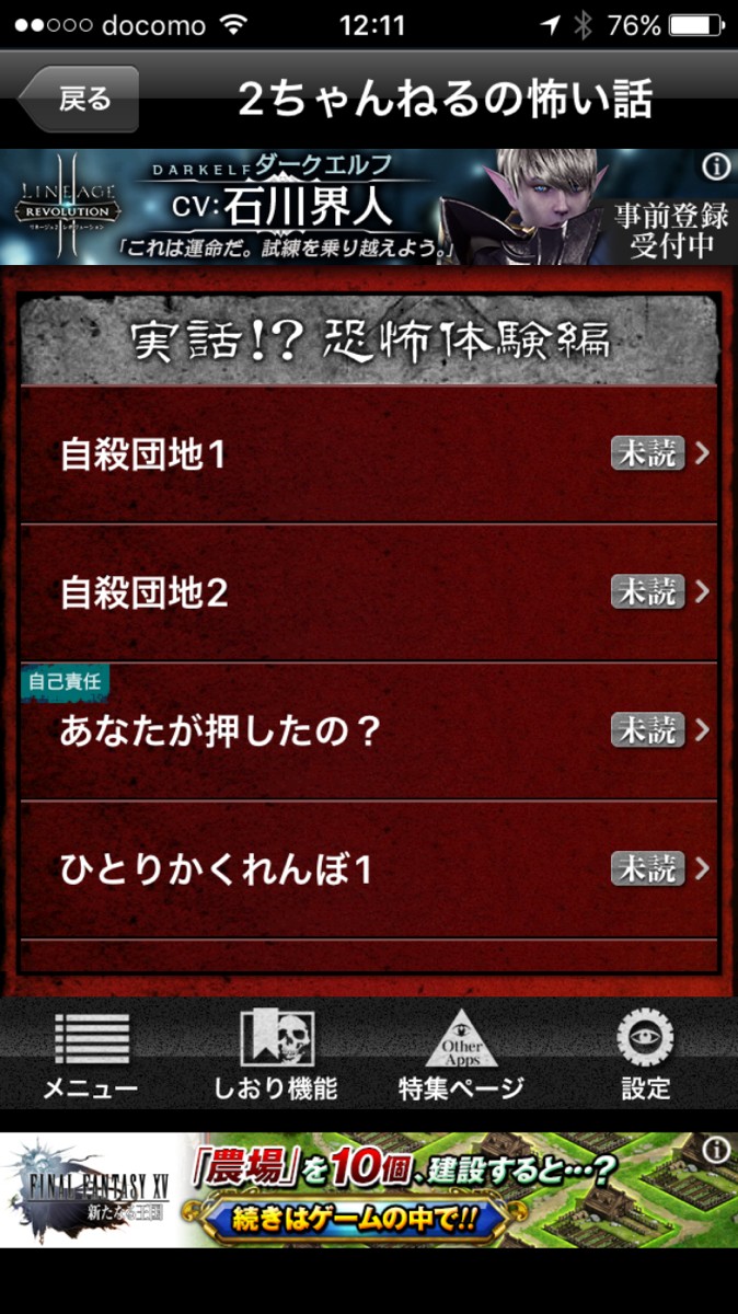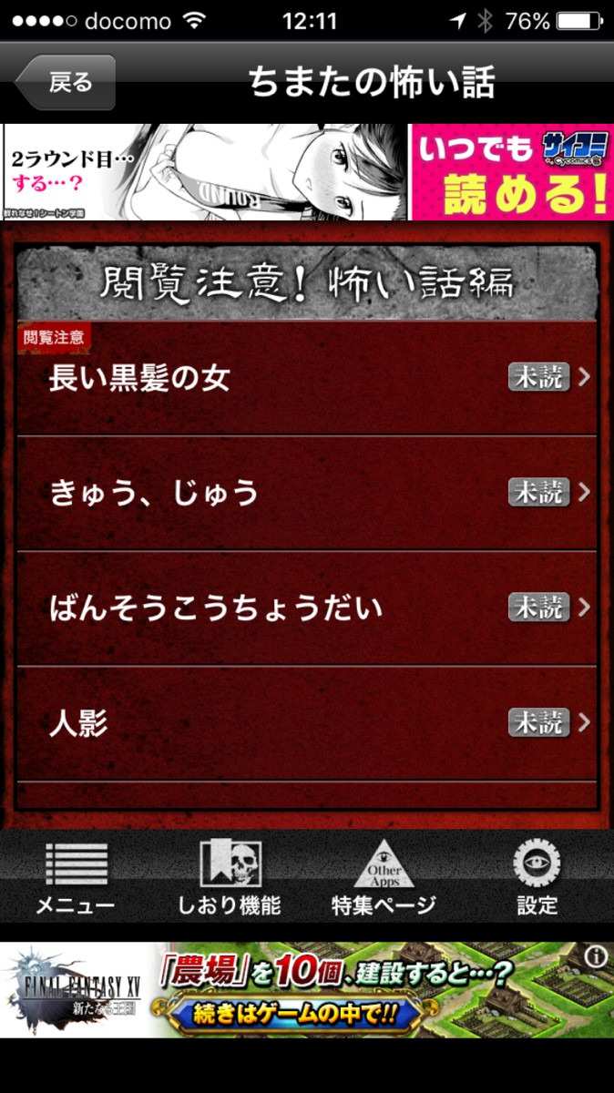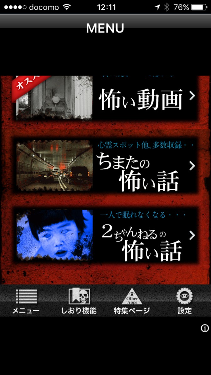 ・「怖い動画」「ちまたの怖い話」「2ちゃんねるの怖い話」の中から、怖い話をタップ