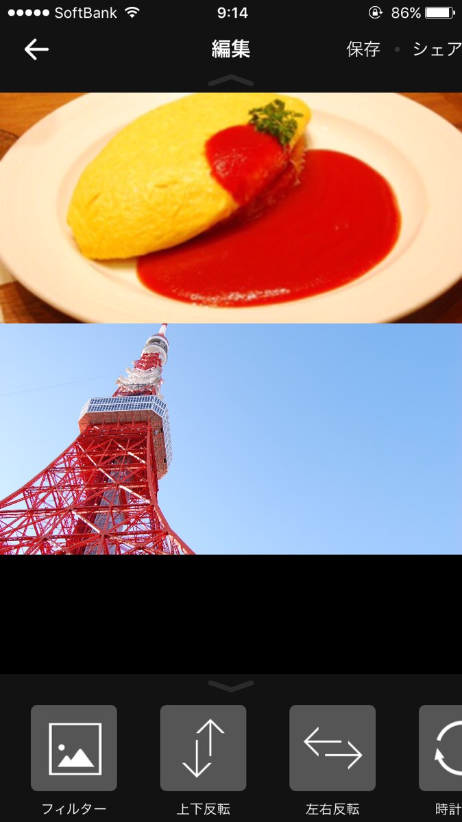 3.「フィルター」「上下反転」「左右反転」「時計回り」「反時計回り」「明るさ」「枠線」の機能がそろっているので、自由に加工してみましょう。フィルターは制限を解除していないバージョンでもかなりの数が揃っています。これだけ用意されていれば、写真の雰囲気にあったものが見つかるでしょう。また、美肌に見えるフィルターもあるので、より美しい写真が投稿できますね。