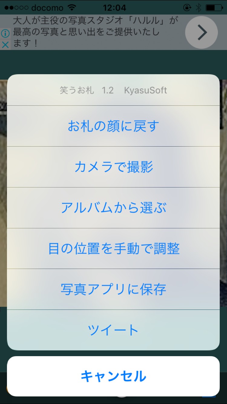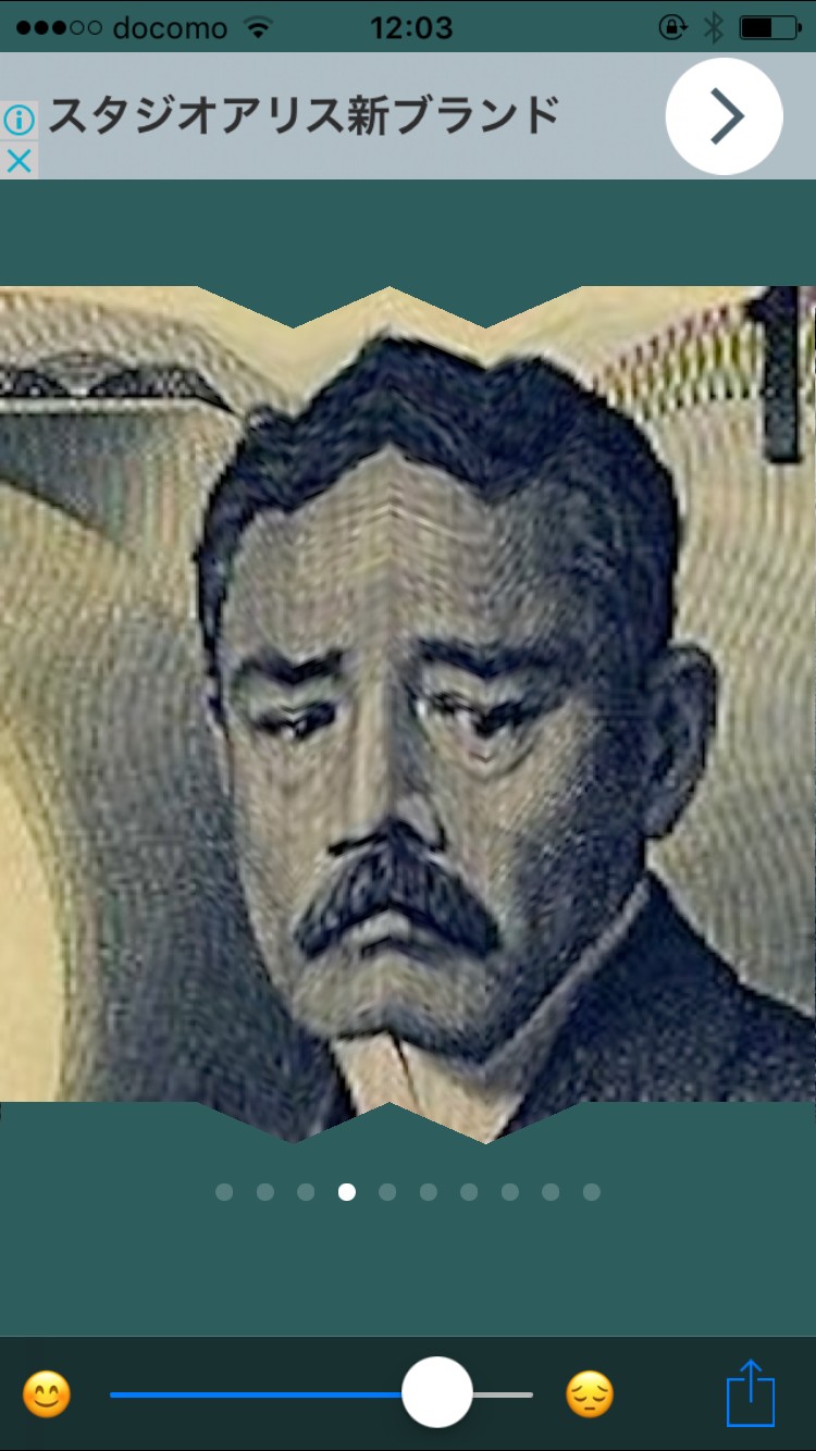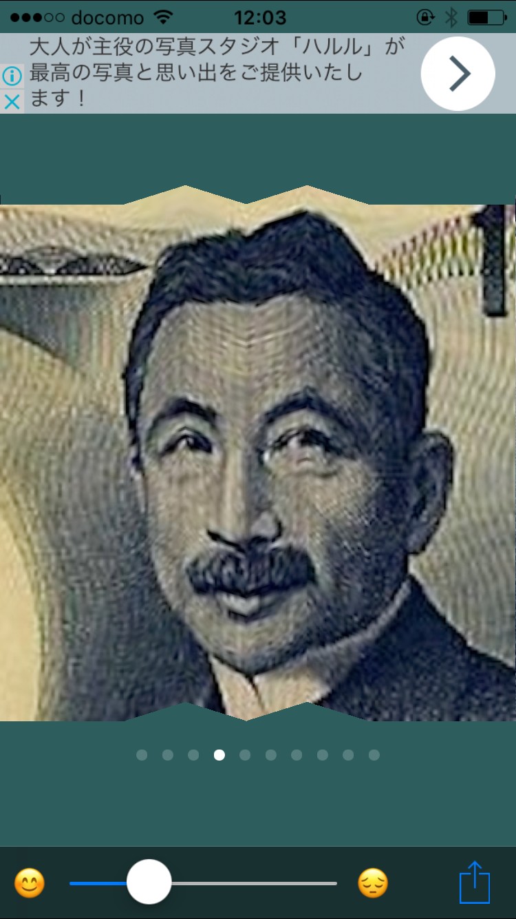 プリセットされている肖像画が表示されます。スライドで変更できます。ご存じ福沢諭吉から、よくわからない昔の人まで様々!今回はちょっぴり懐かしい夏目漱石で遊んでみることにしました。